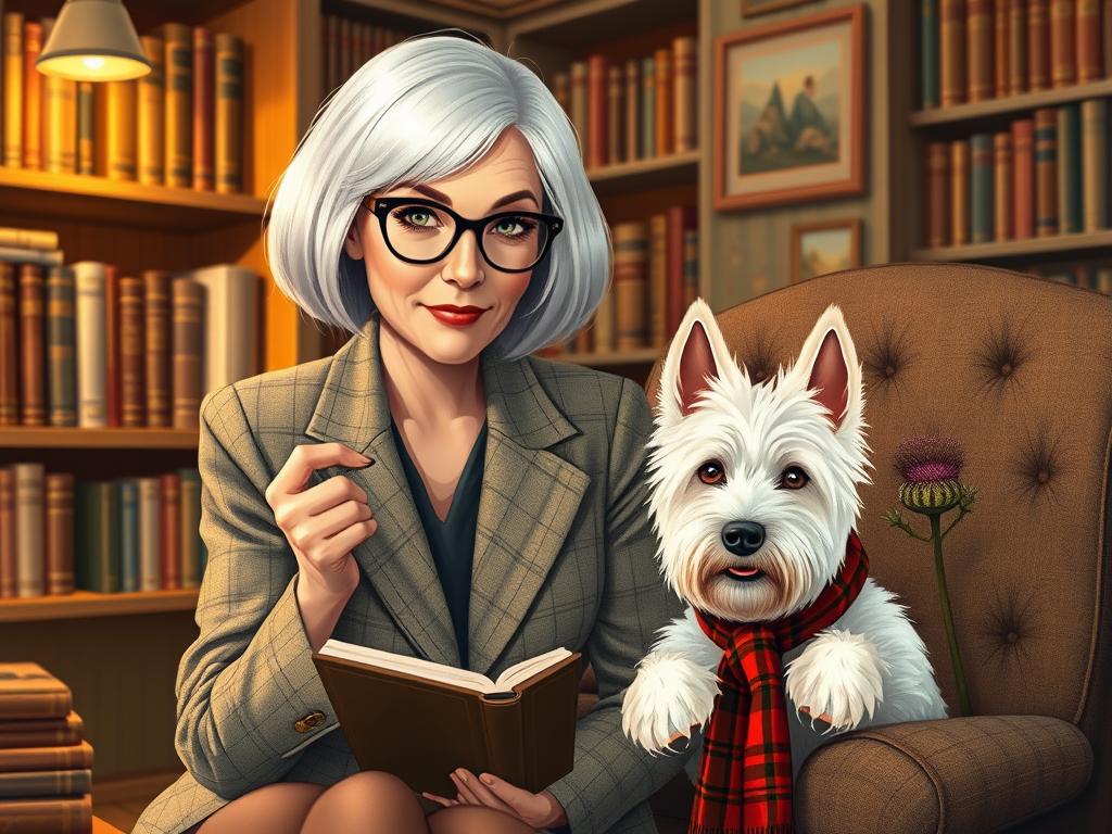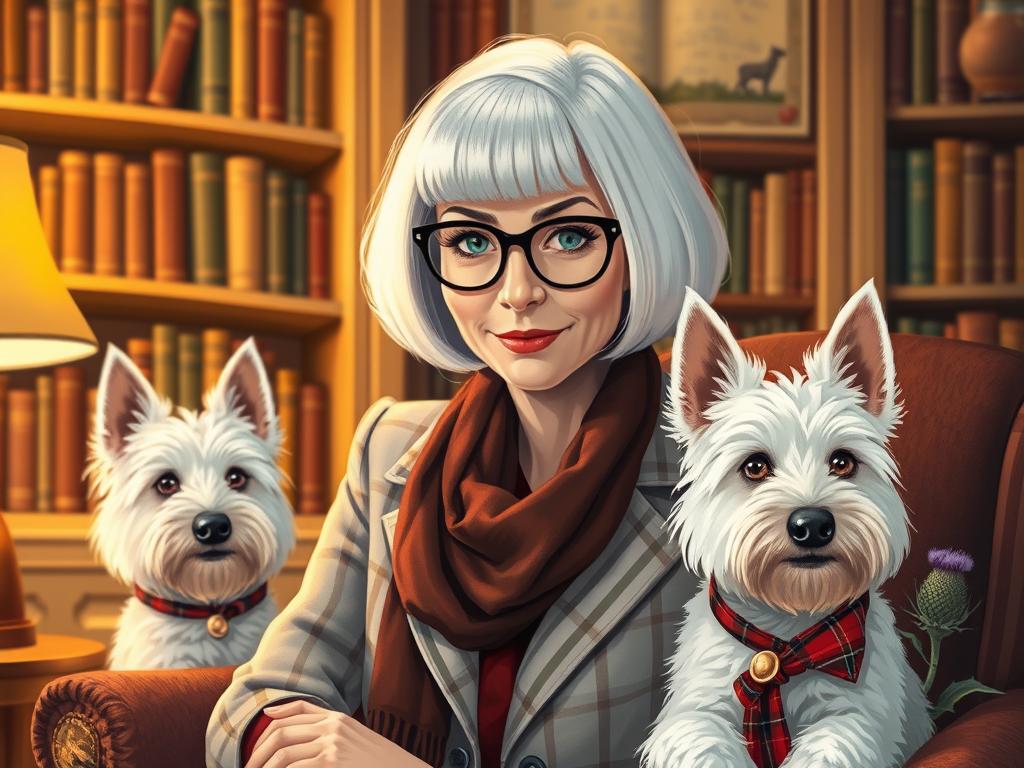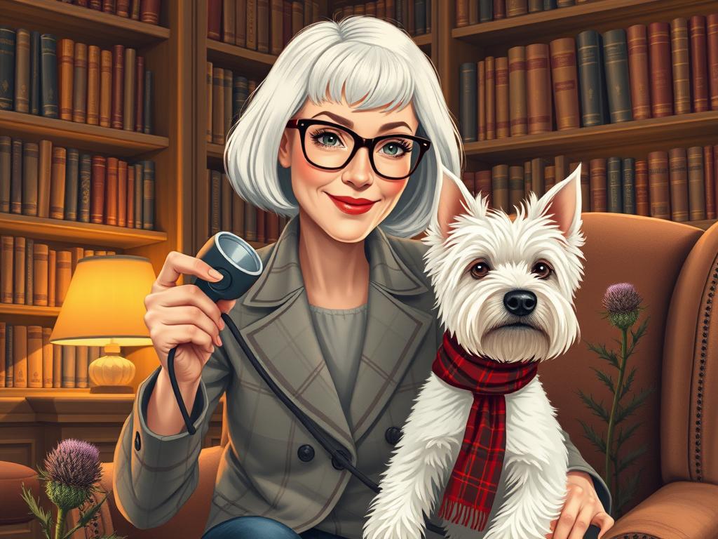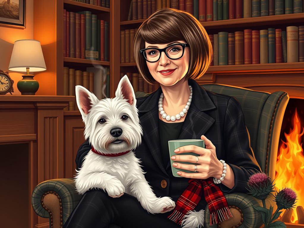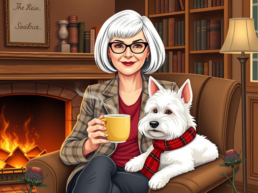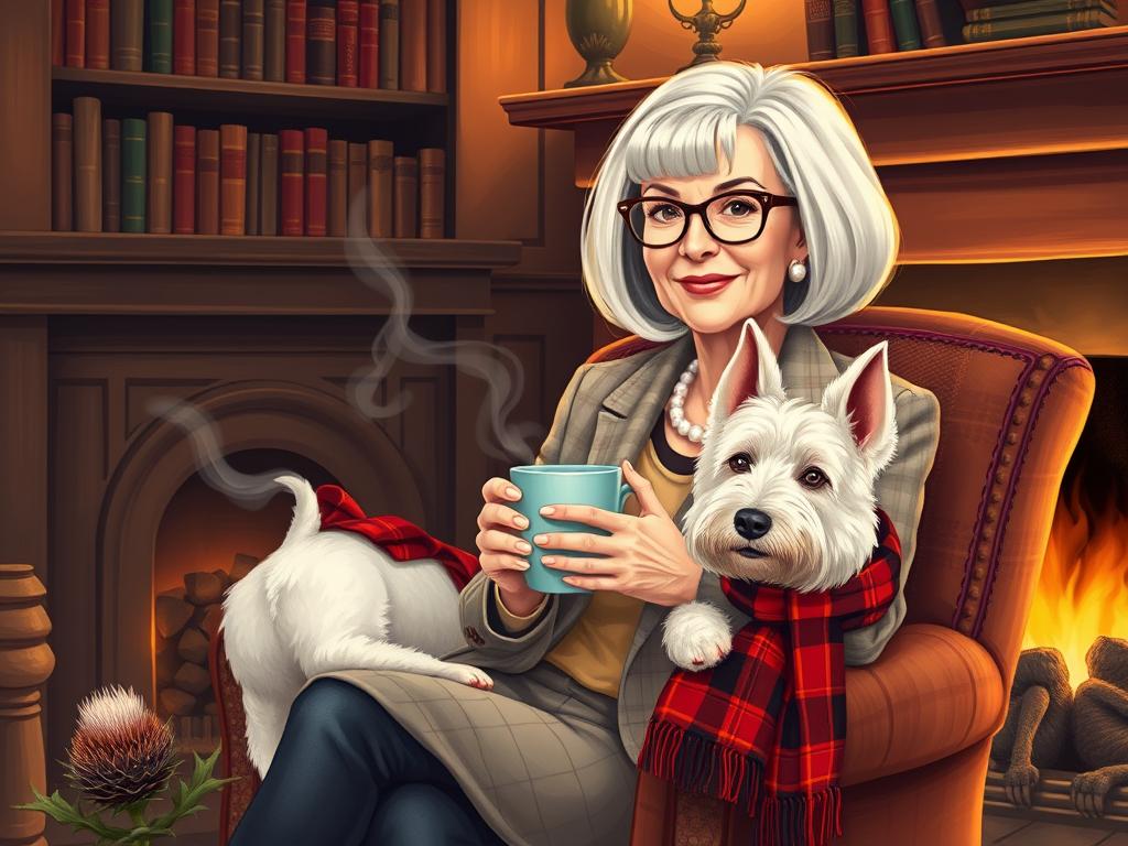 A cozy, a high quality illustration vintage-style portrait of a sophisticated middle-aged woman sitting in an armchair by the fireplace, holding a steaming mug of tea. She has a classic bob haircut, wears elegant glasses, a pearl necklace, and a dark plaid blazer. Seated beside her is a white West Highland Terrier (Westie) with a red tartan scarf. The background features warm lighting, wooden bookshelves filled with books, and a soft Scottish thistle near the armchair. The atmosphere is warm, peaceful, and inviting — perfect for a cozy mystery setting.