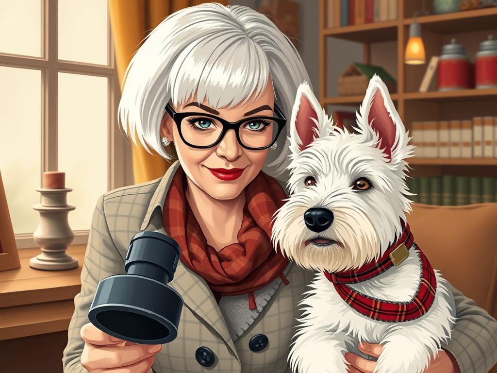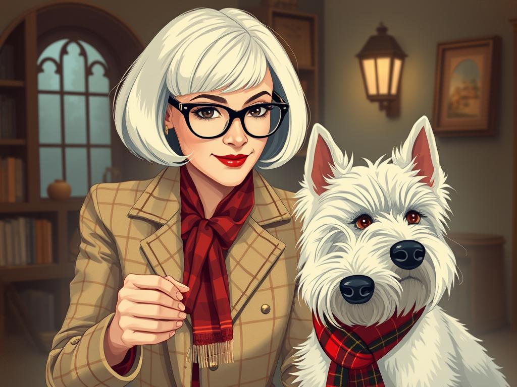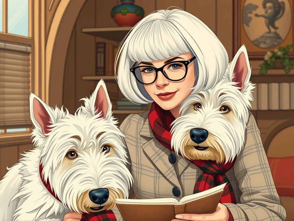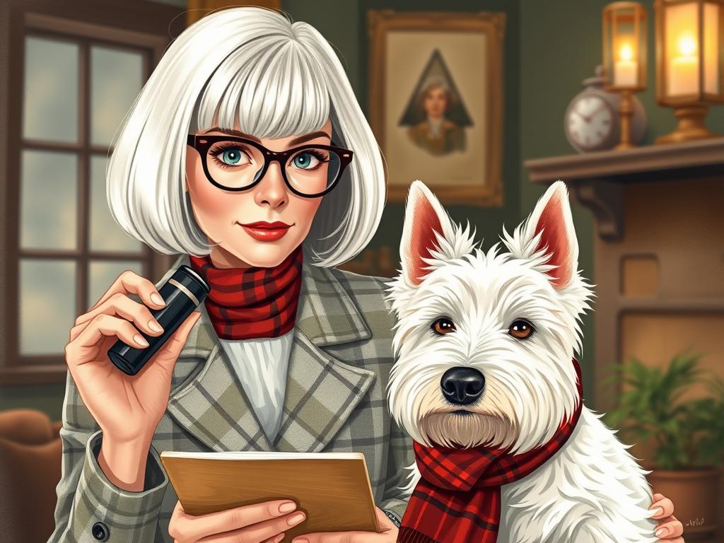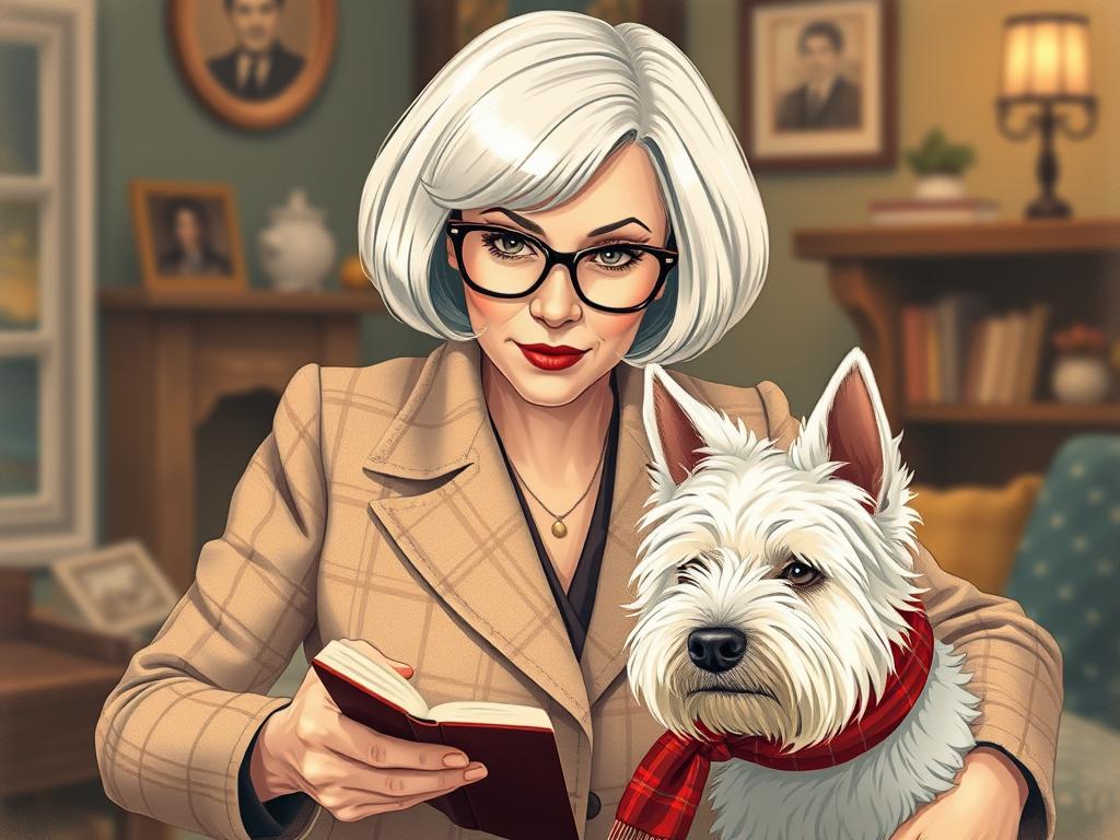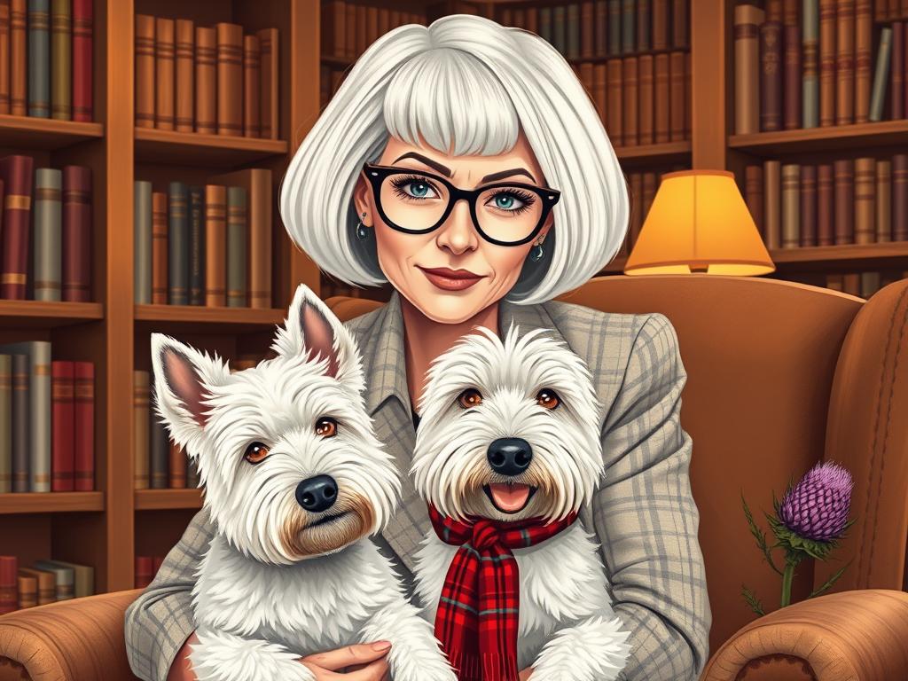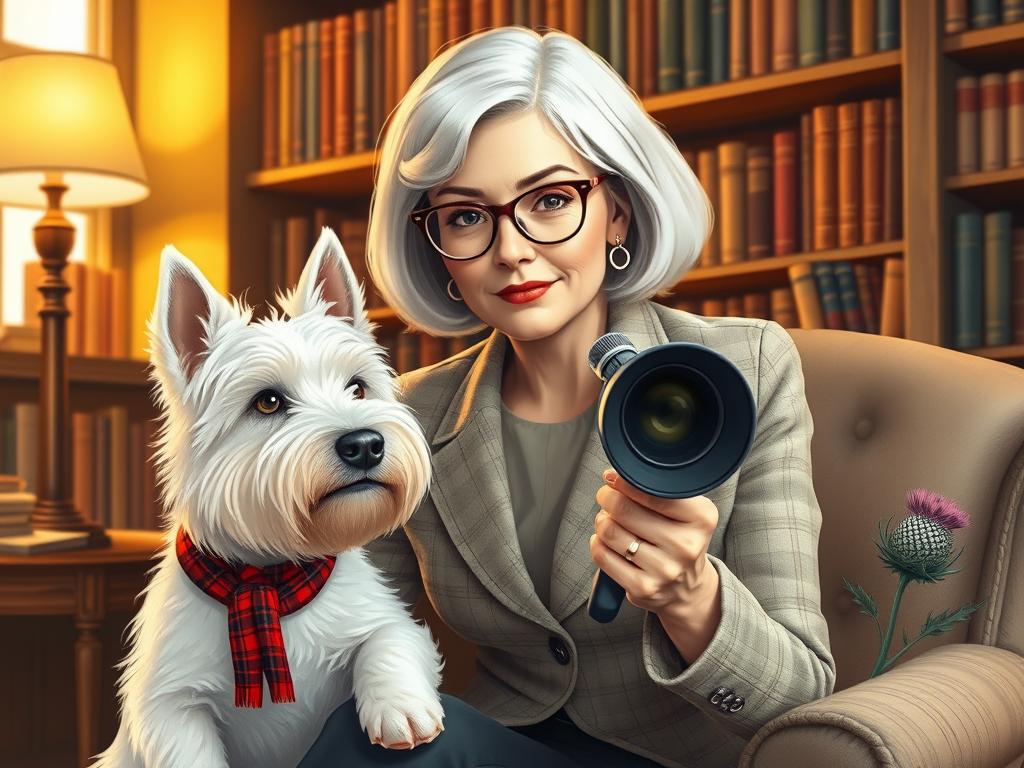 A cozy, a high quality illustration vintage-style portrait of a sophisticated middle-aged woman sitting in an armchair by the fireplace, holding a steaming mug of tea. She has a classic bob haircut, wears elegant glasses, a pearl necklace, and a dark plaid blazer. Seated beside her is a white West Highland Terrier (Westie) with a red tartan scarf. The background features warm lighting, wooden bookshelves filled with books, and a soft Scottish thistle near the armchair. The atmosphere is warm, peaceful, and inviting — perfect for a cozy mystery setting.