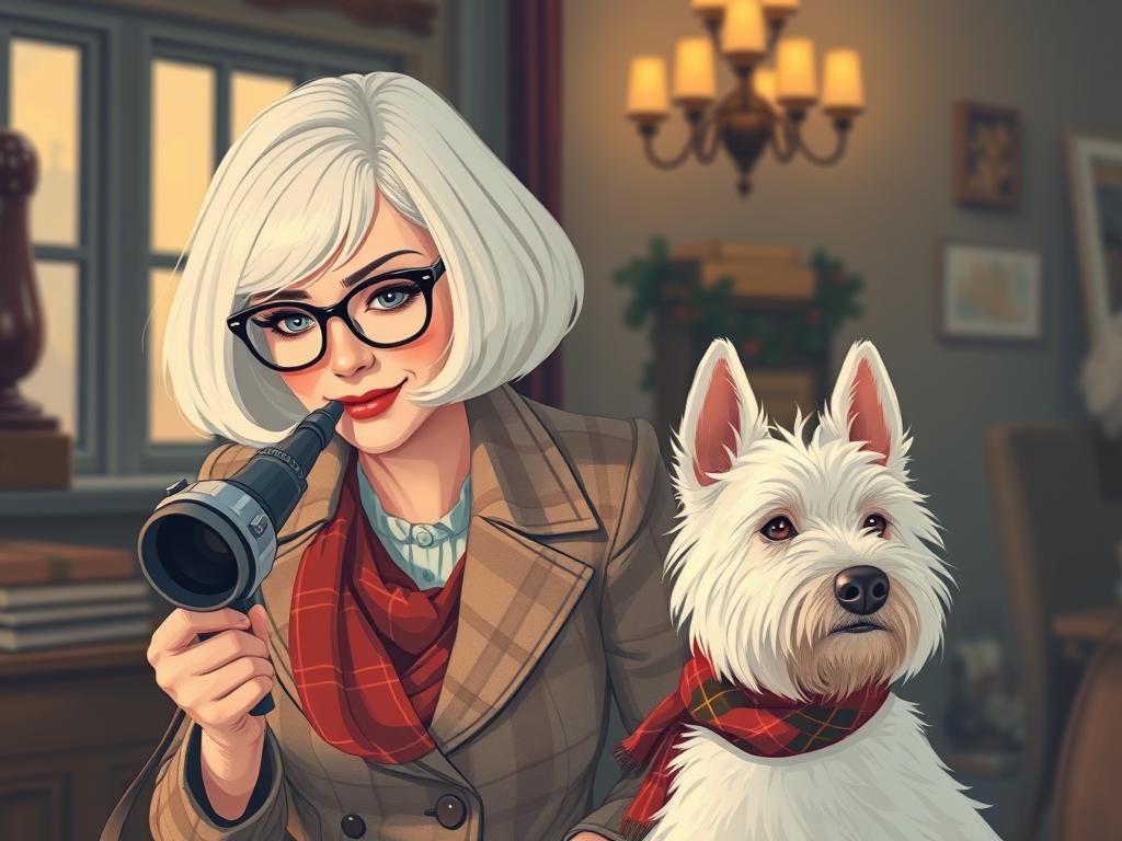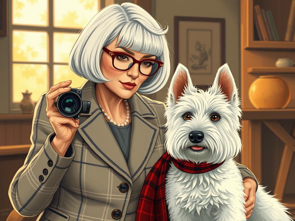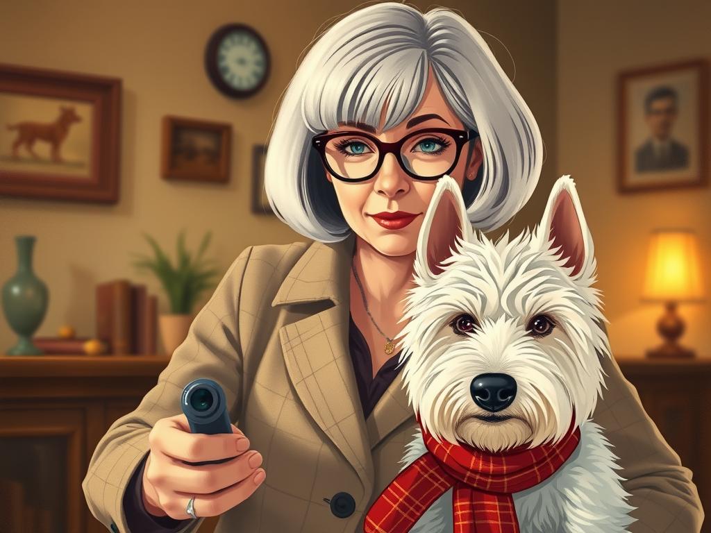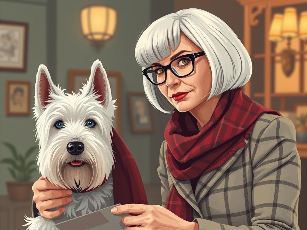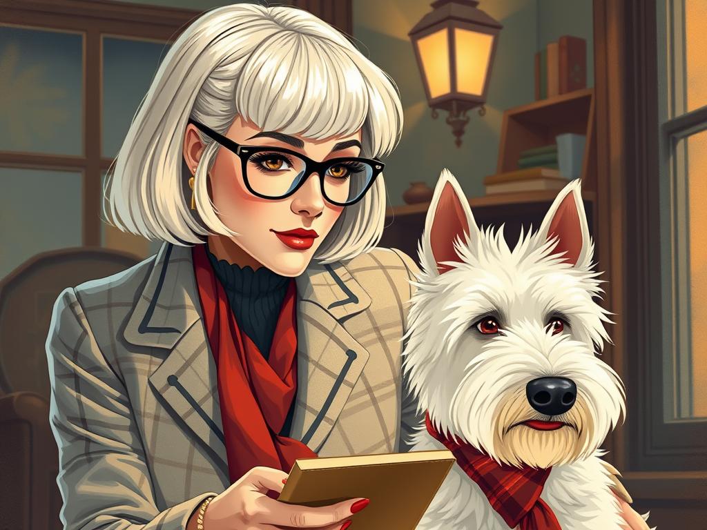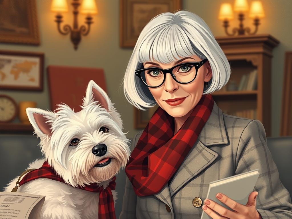 A cozy, a high quality illustration vintage-style portrait of a sophisticated middle-aged woman sitting in an armchair by the fireplace, holding a steaming mug of tea. She has a classic bob haircut, wears elegant glasses, a pearl necklace, and a dark plaid blazer. Seated beside her is a white West Highland Terrier (Westie) with a red tartan scarf. The background features warm lighting, wooden bookshelves filled with books, and a soft Scottish thistle near the armchair. The atmosphere is warm, peaceful, and inviting — perfect for a cozy mystery setting.