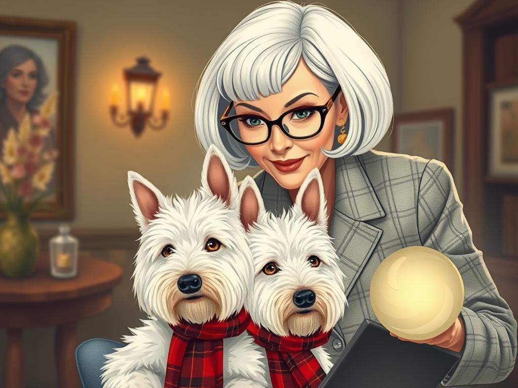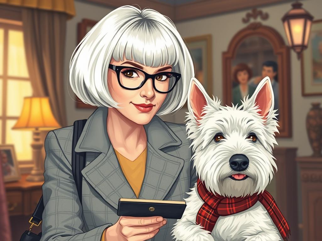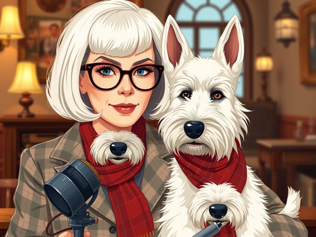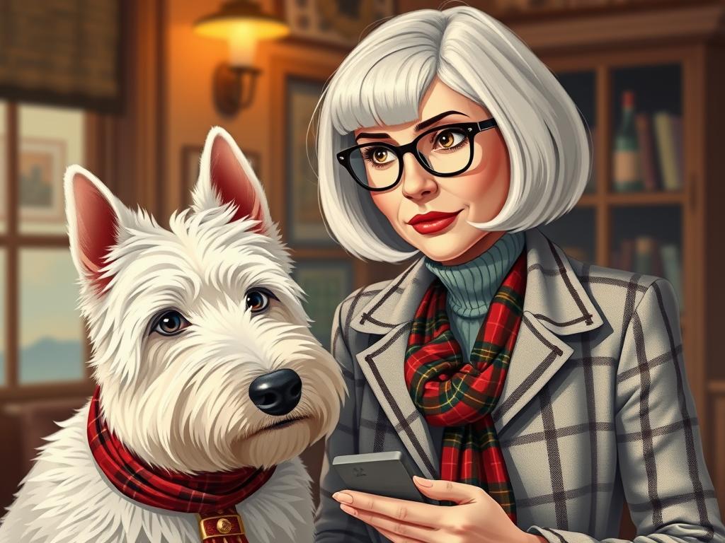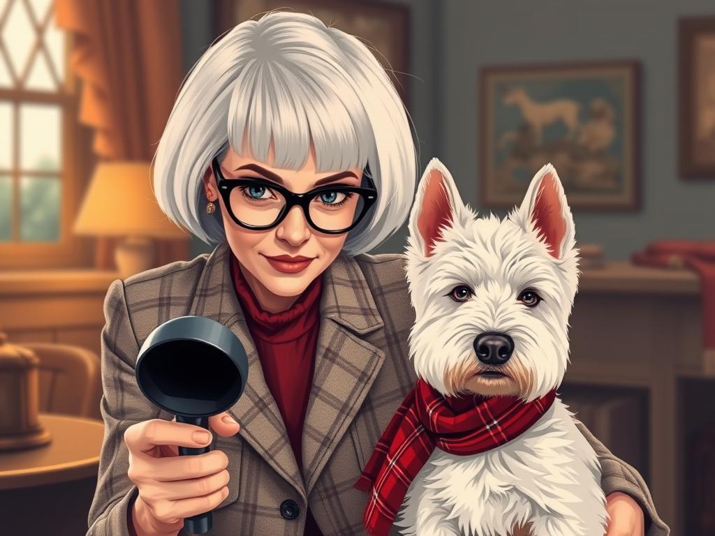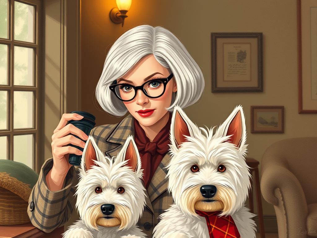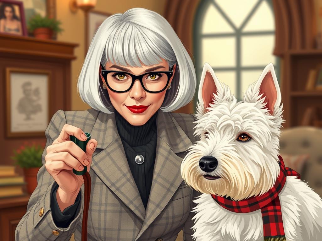A cozy, a high quality illustration vintage-style portrait of a sophisticated middle-aged woman sitting in an armchair by the fireplace, holding a steaming mug of tea. She has a classic bob haircut, wears elegant glasses, a pearl necklace, and a dark plaid blazer. Seated beside her is a white West Highland Terrier (Westie) with a red tartan scarf. The background features warm lighting, wooden bookshelves filled with books, and a soft Scottish thistle near the armchair. The atmosphere is warm, peaceful, and inviting — perfect for a cozy mystery setting.