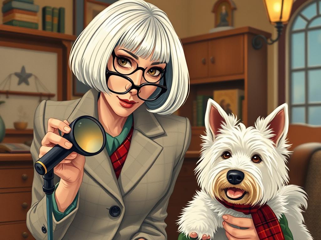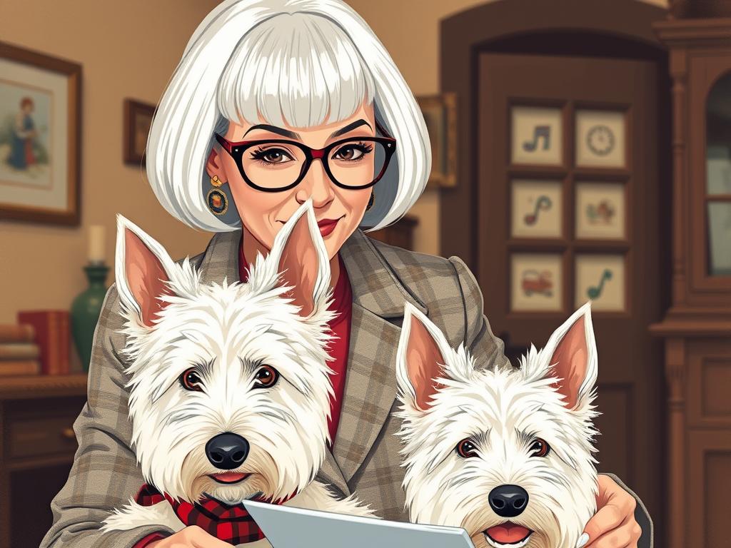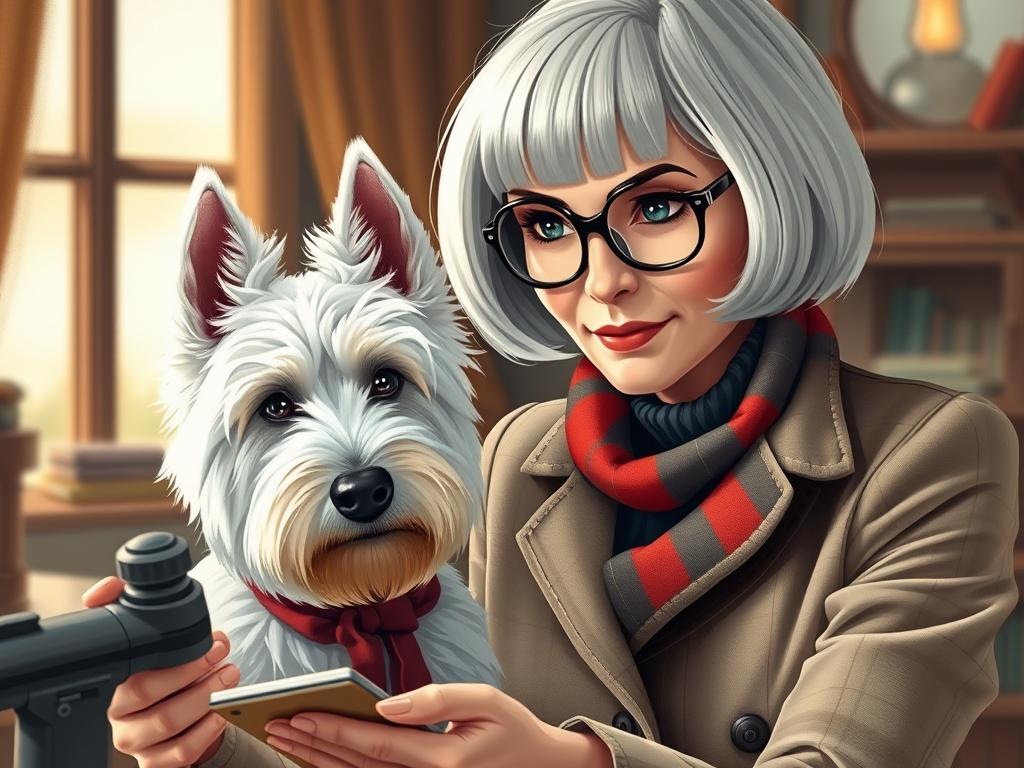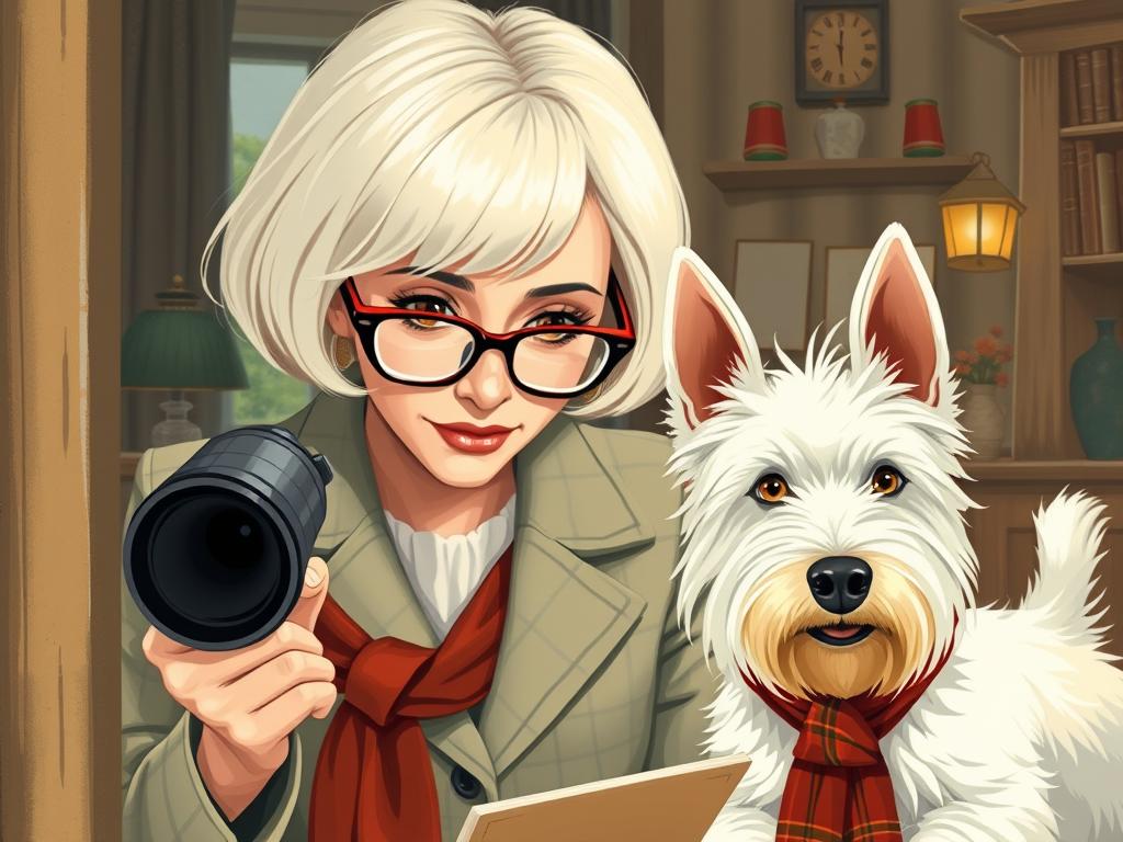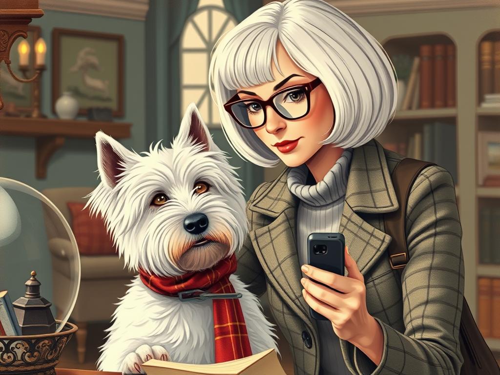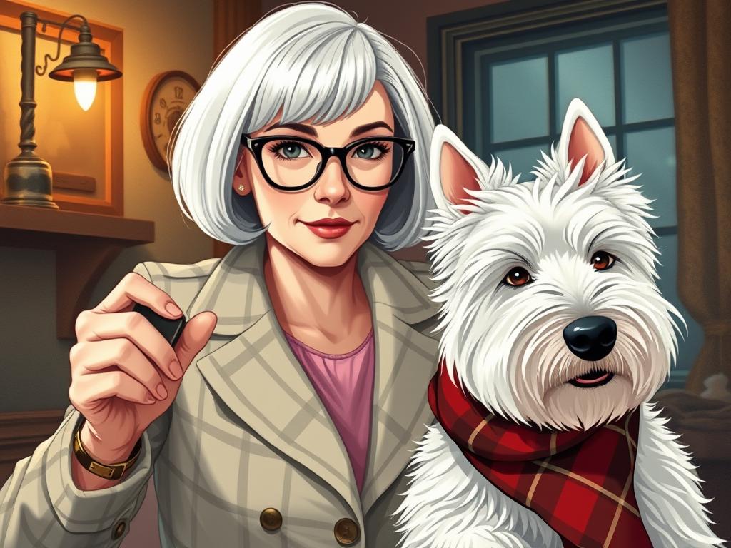 A cozy, a high quality illustration vintage-style portrait of a sophisticated middle-aged woman sitting in an armchair by the fireplace, holding a steaming mug of tea. She has a classic bob haircut, wears elegant glasses, a pearl necklace, and a dark plaid blazer. Seated beside her is a white West Highland Terrier (Westie) with a red tartan scarf. The background features warm lighting, wooden bookshelves filled with books, and a soft Scottish thistle near the armchair. The atmosphere is warm, peaceful, and inviting — perfect for a cozy mystery setting.