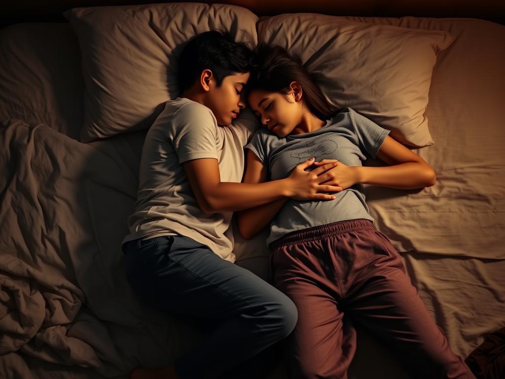 An Indian boy and girl sleeping on bed together in night. Boy age is 19 years old and girl age is 13 years old. Boy wear simple t-shirt & pant and girl wear t-shirt and pant. Girl facing opposite of boy and boy facing towards girl hairs. Both are sleeping on side way of left hand. Girl ass was touching boy waistband of pant cock bugle under waistband. Boy put his hand on girl stomach to pull towards him closer. Girl t-shirt from one side of shoulder was exposed and boy kiss on girl's expose shoulder from her back. Boy waistband was rubbing on girls ass through pant. Boy free hand squeezing girl ass gently through her pant.