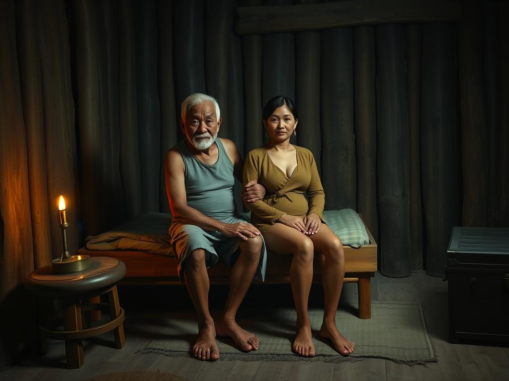 draw – Ultra-realistic cinematic photograph, vertical 4:5. Nighttime rural interior: humble wooden bedroom, rough plank walls, bare floor, minimal furnishings (low stool, woven mat, old trunk). No electricity. Sole light: a flickering oil lamp (2000–2500K) on the corner, casting a warm, trembling pool of light. Outside: deep darkness, distant crickets, silhouettes of swaying banana trees. Seated on the edge of a low wooden bed: a skinny 68-year-old Javanese man in a worn cotton tank top and loose shorts, barefoot. He gently holds her knee, the other resting on the bed, his face half-lit—eyes filled with deep affection, filial love, or unresolved longing. A 39-year-old Sundanese woman sitting side by side before him: serene, hourglass figure, large full breasts accentuated by a modest, unbuttoned long-sleeved linen kebaya in earth tones; sheer thong highlights wide hips and thick thighs. Hair in a neat top bun, loose strands framing her face. hands resting on bed, legs slightly parted, gazing down with quiet exhaustion and contemplation. Lighting is cinematic yet natural: volumetric flame glow highlights skin texture, fabric folds, and eyes (with subtle flame reflections), while rich shadows swallow the periphery. Color palette: deep blacks, desaturated browns/greys, warm amber accents. Skin tones golden in light, cooling softly into shadow. Mood: intimate yet tense—a silence heavy with secrets, intergenerational care, and unspoken history. The flame doesn’t burn in devotion, but in witness. Shot on Canon EOS R5 with 85mm f/1.2 prime lens: ultra-shallow depth of field, natural vignetting, soft lens flare. 8K HDR, hyper-realistic detail (pores, hair strands, fabric texture), inspired by Technicolor elegance. A masterful blend of raw realism and poetic visual storytelling.