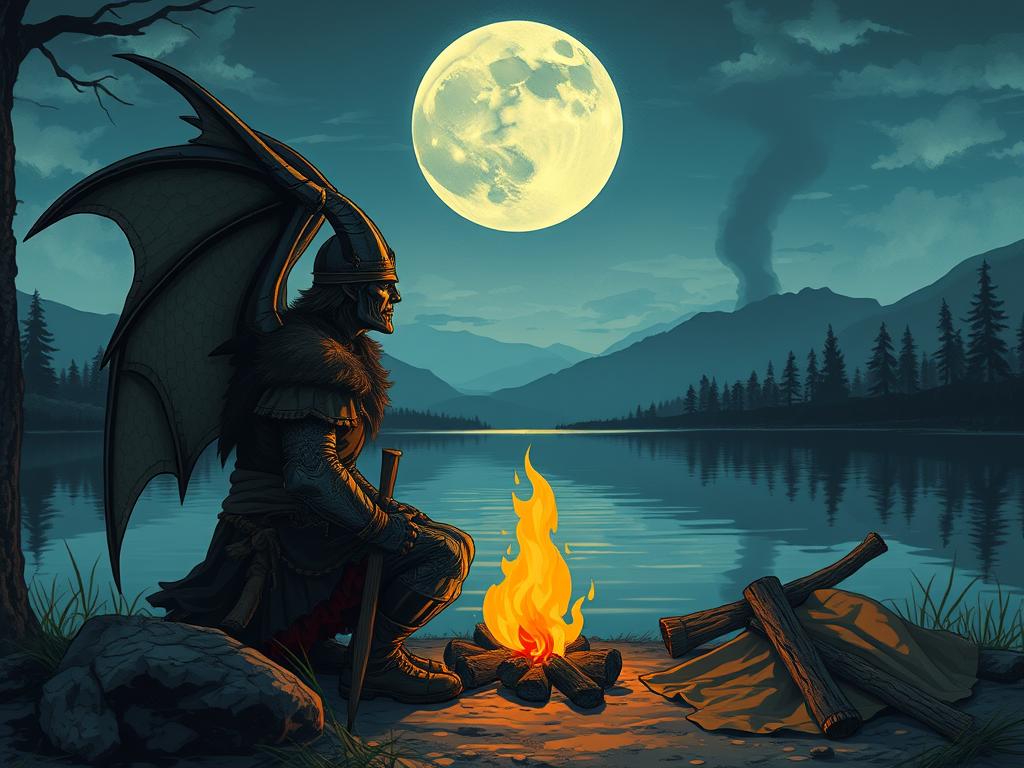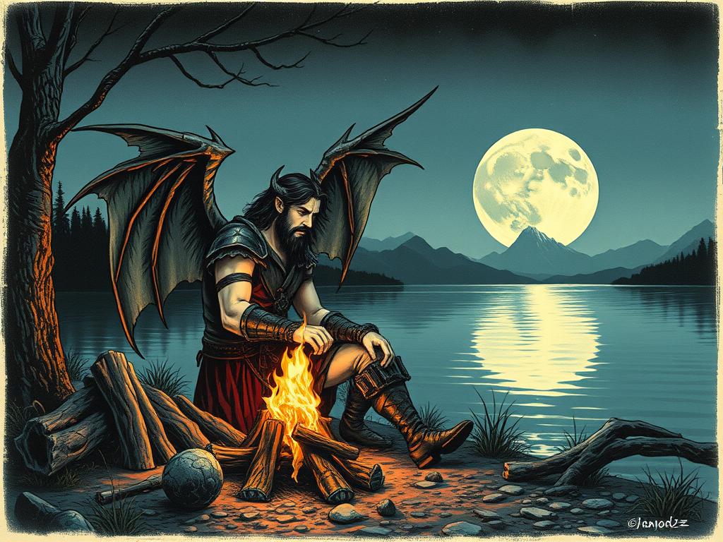Illustration of a Highlander with gargoyle wings, sitting beside a campfire on the shore of a lake, the full moon reflecting upon the water behind him...