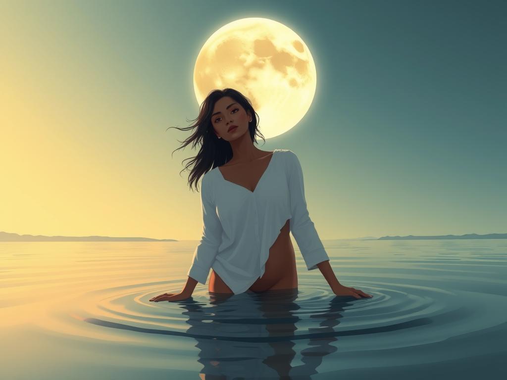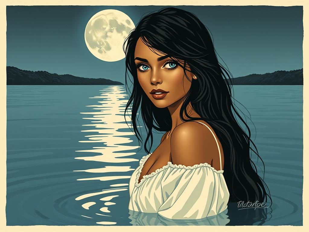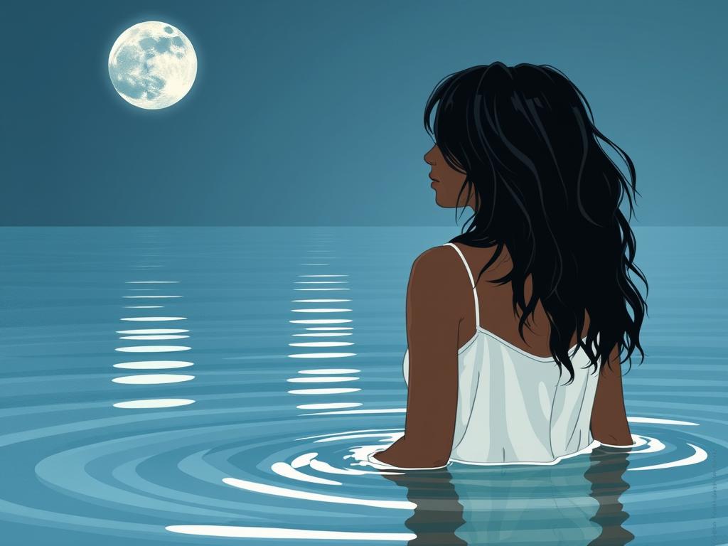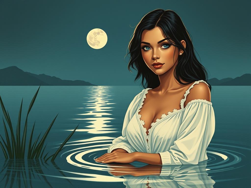 ilustracion de una mujer de cabello negro saliendo de un lago se le ve el cuerpo entero, lleva un camisón blanco de manga larga y la luna llena se refleja tras ella-