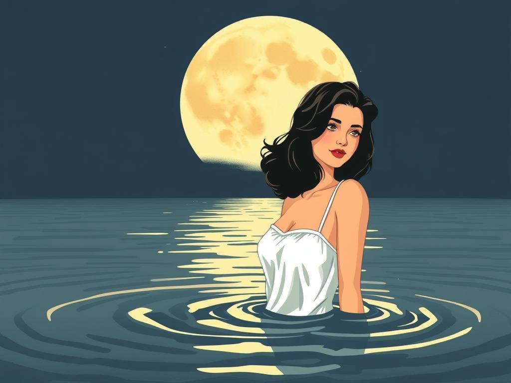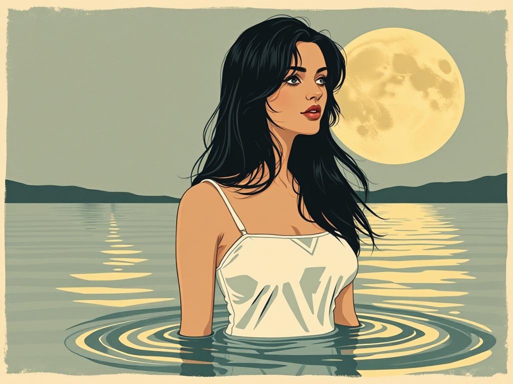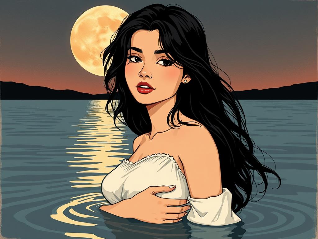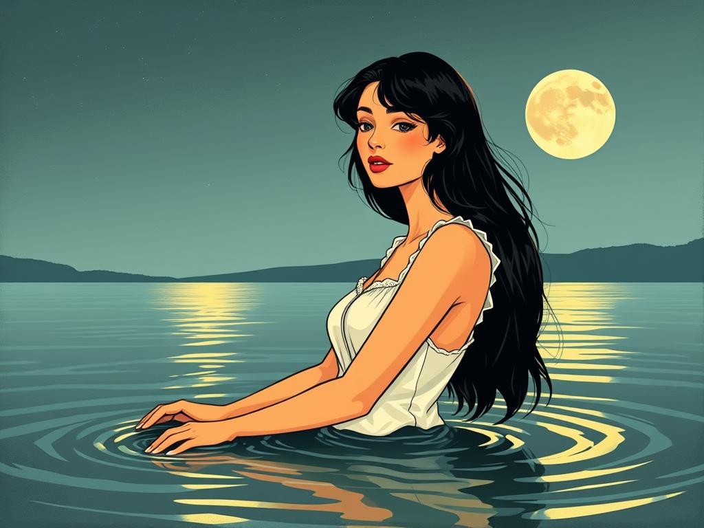 ilustracion vintage de una mujer de 20 años con el cabello largo y negro, sale de un lago mientras la luna llena esta detras de ella, lleva un camisola blanca que se le adhiere al cuerpo.