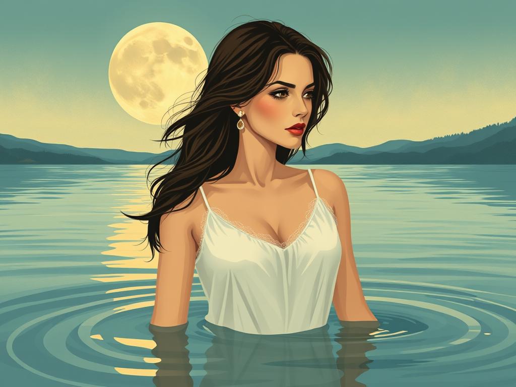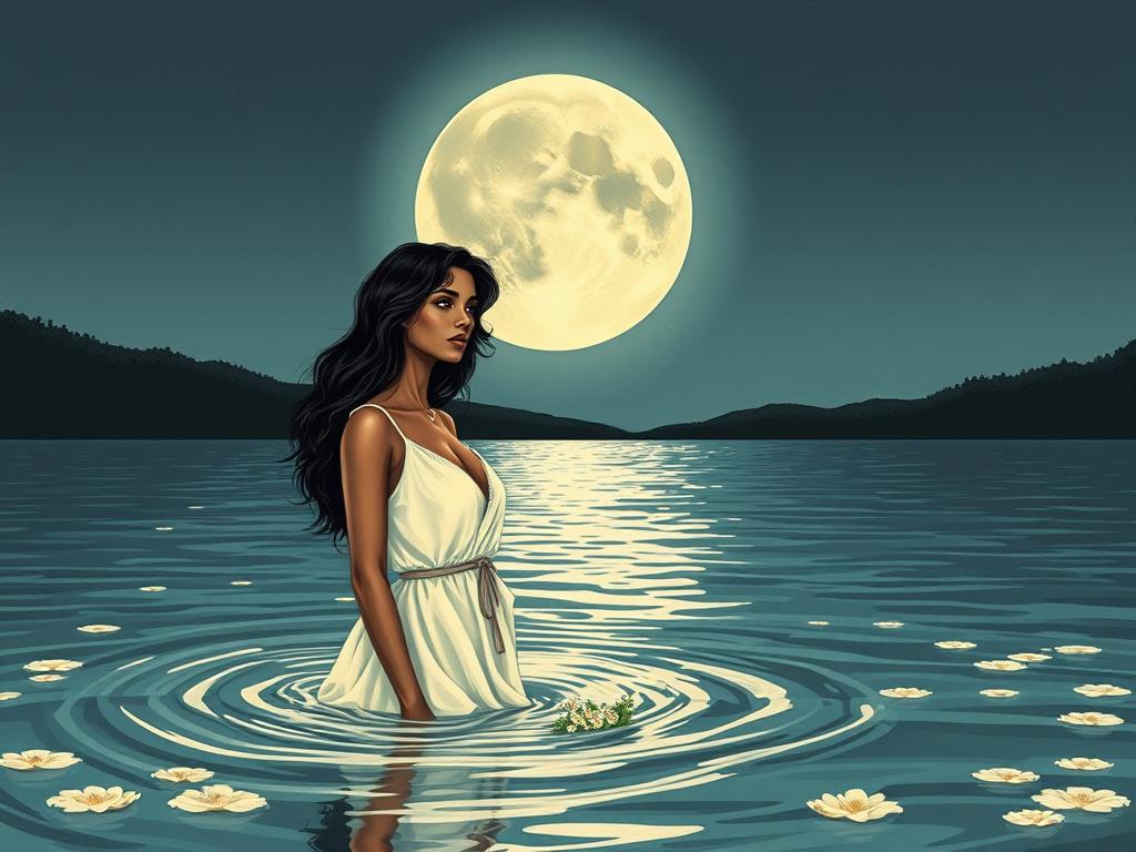 Ilustración vintage. El satinado velo de la luna se deleitaba sobre las plácidas aguas del lago, de las cuales una mujer sensual, guapa de cabello largo y negro emerge vestida con un camisón blanco de manga larga.