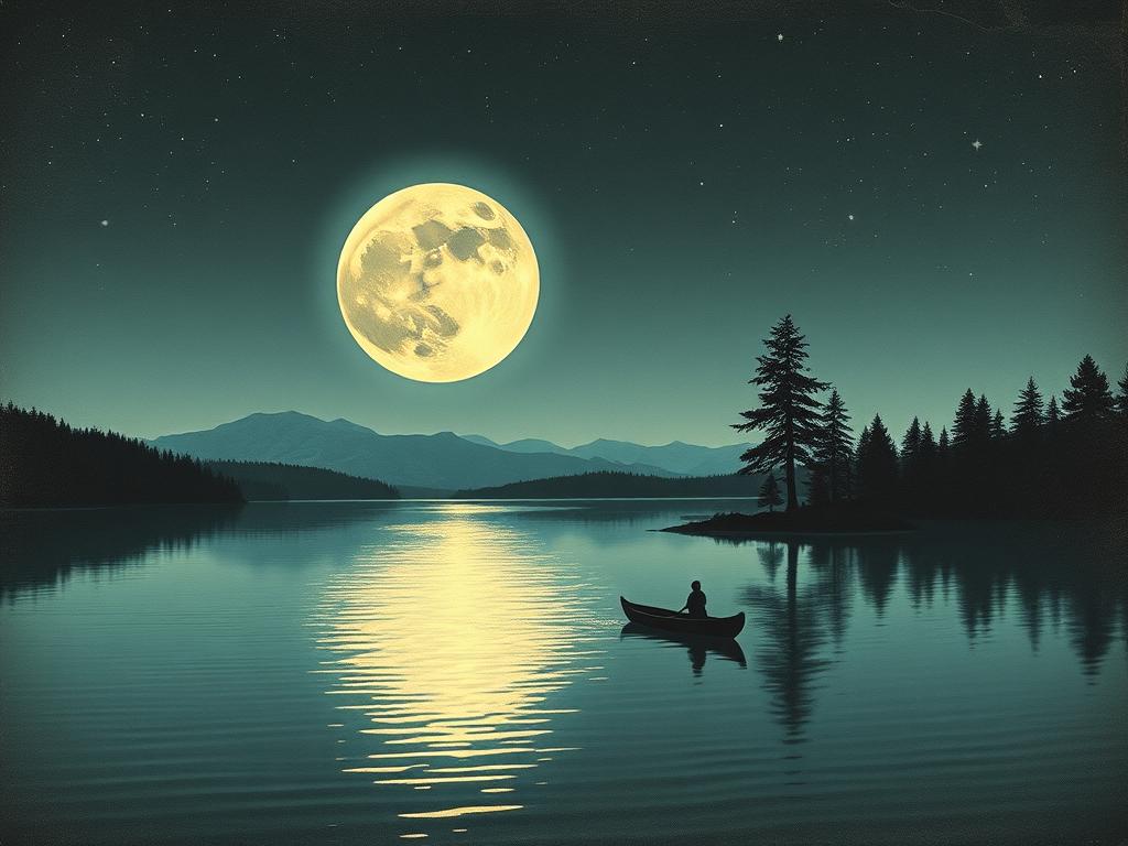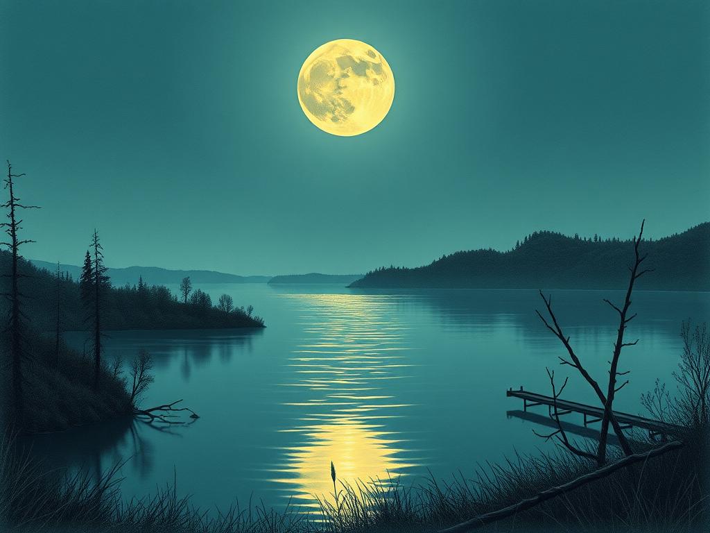 Ilustración vintage la luna llena se refleja sobre un lago Version 1