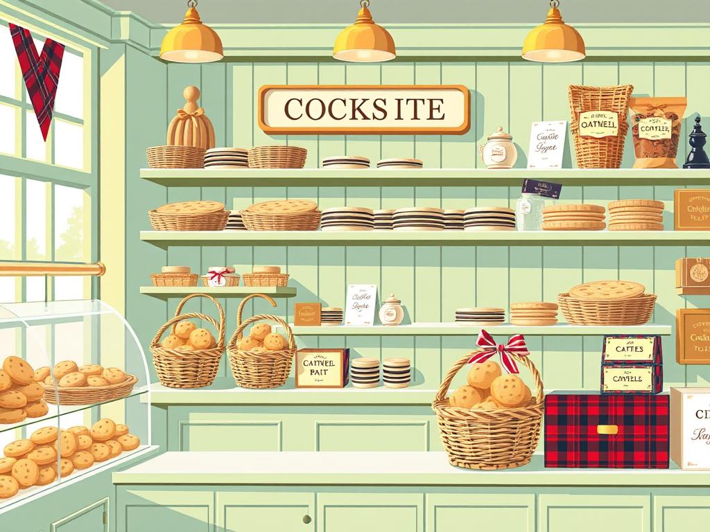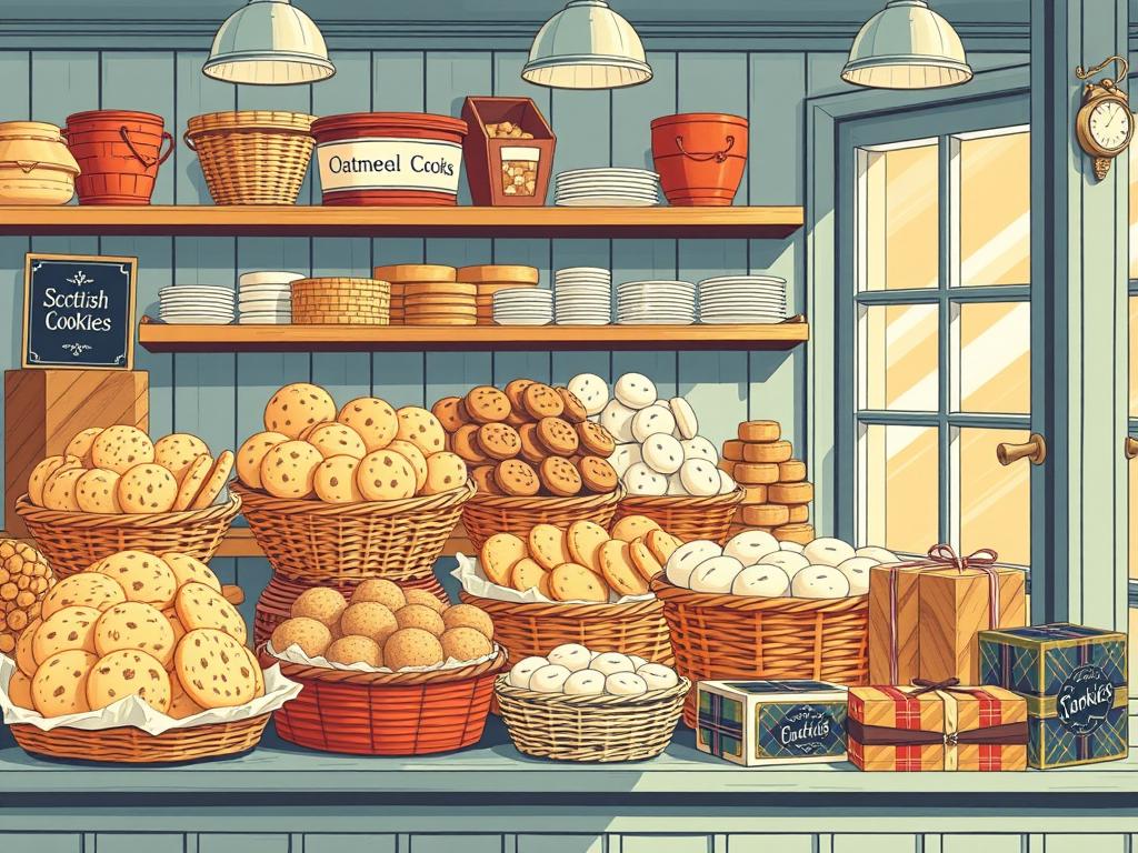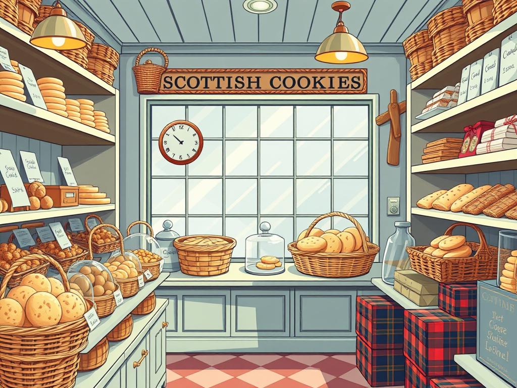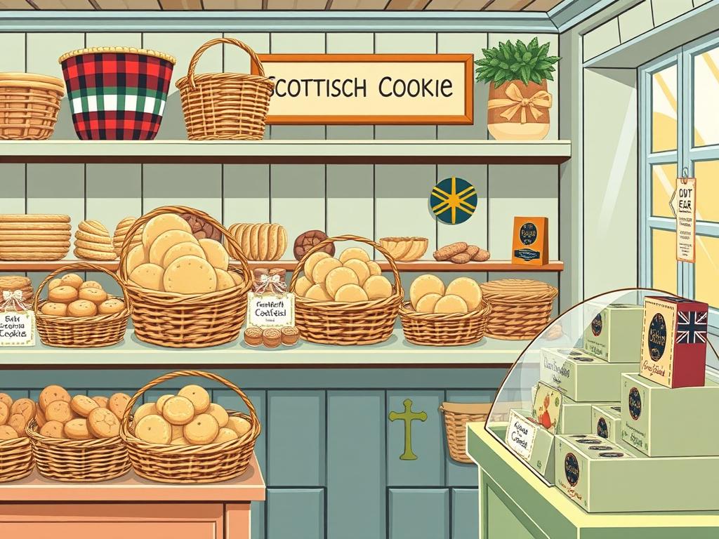 Ilustration vintage Showcase of a Scottish cookie store with light and bright colors, on the shelves there are baskets with oatmeal cookies, scones, and some boxes of Scottish tartan