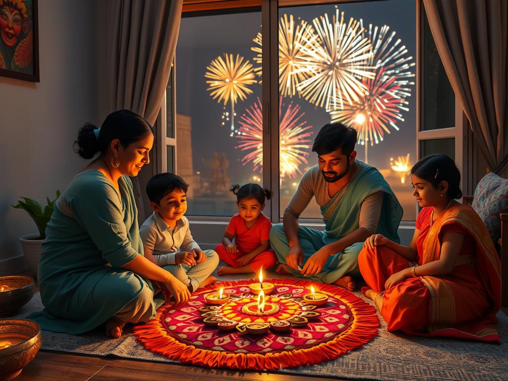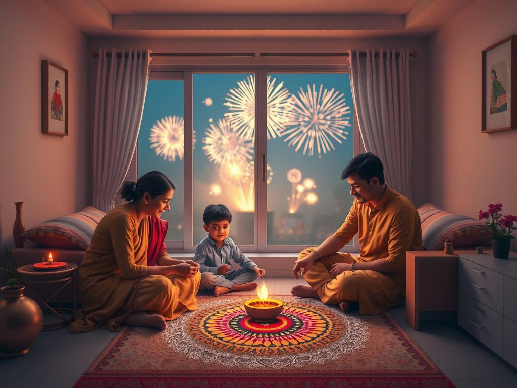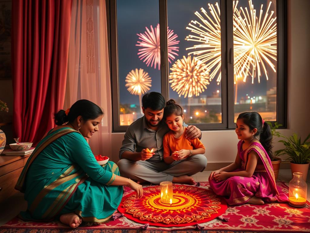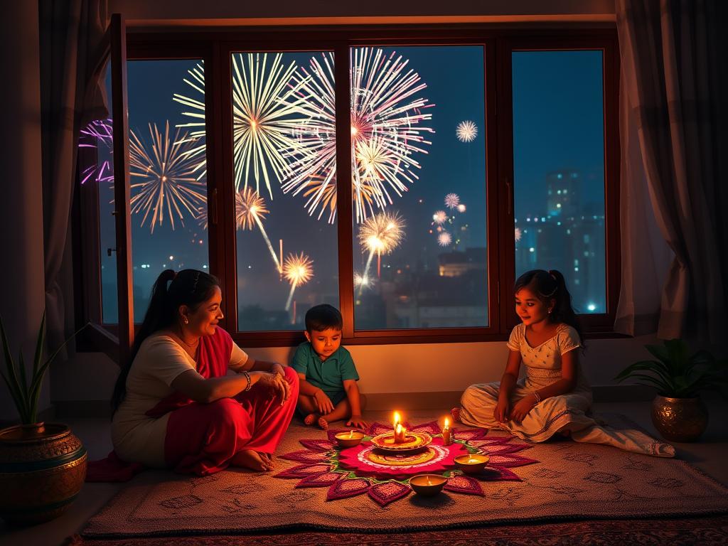 indian family (mother, father, 1 boy kid, 1 girl kid) sitting, making rangoli, celebrating diwali inside home while fireworks happening outdoors viewed from the window, well light room, 4k
