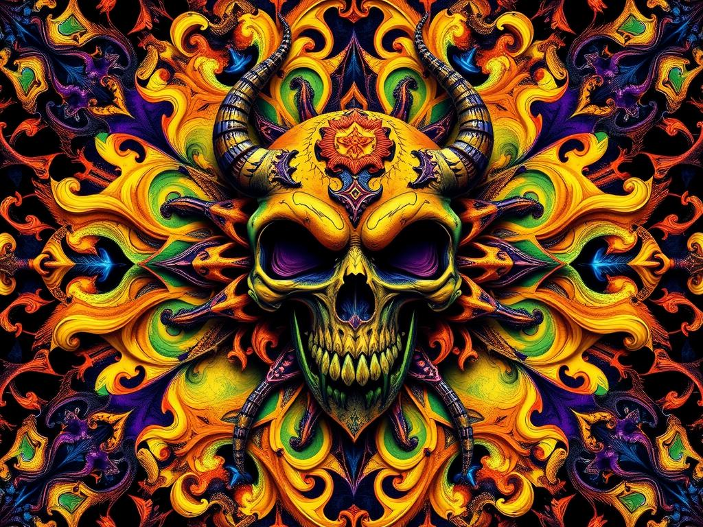 lowbrow deathsurrealism colorful fractal image lace chiffon pattern. Use a combination of black, yellow, blue, orange, and purple hues, and incorporate intricate large demons, monsters, skulls , textured details to give a sense of depth and complexity Extreme lowbrow deathsurrealism colorful 3d highly raised satanic fractal image lace chiffon pattern. Use a combination of suicidal black, yellow, blue, orange, and purple, green, violet, indigo, sapphire-blue, dark plum hues, and incorporate intricate large demons, monsters, skulls , textured details to give a sense of depth and complexity