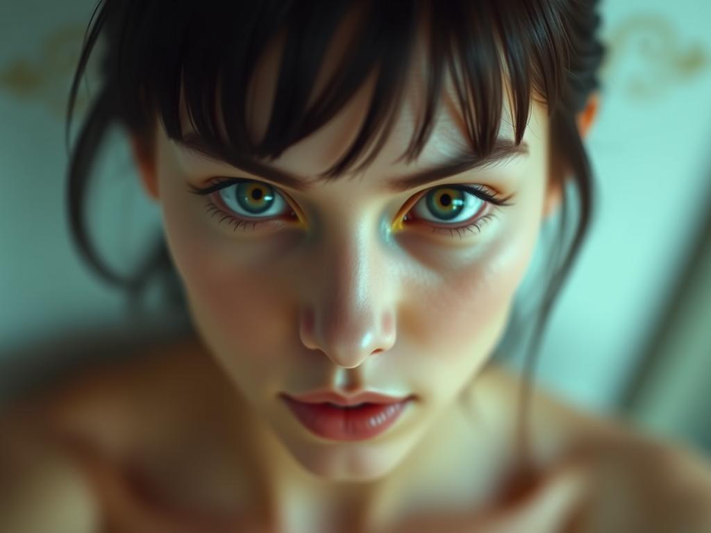 Mika J, realistic looking, staring right at the camera with piercing eyes
