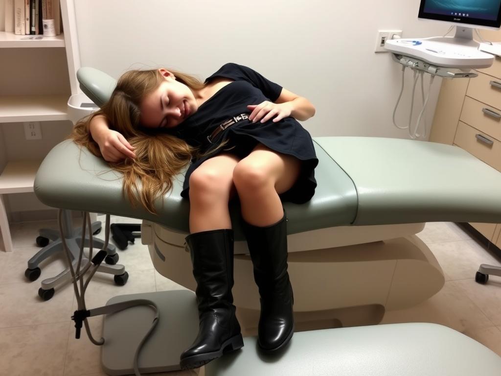 The dentist removed the preteen's skirt, leaving her in her underwear. She was unconscious, asleep, and drugged on the dentist's table. She was wearing a very short miniskirt, black boots, and a very open T-shirt that exposed her chest.
