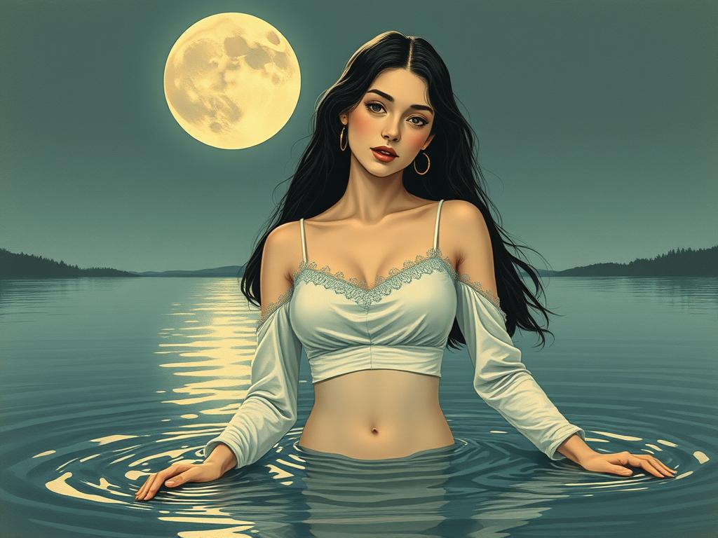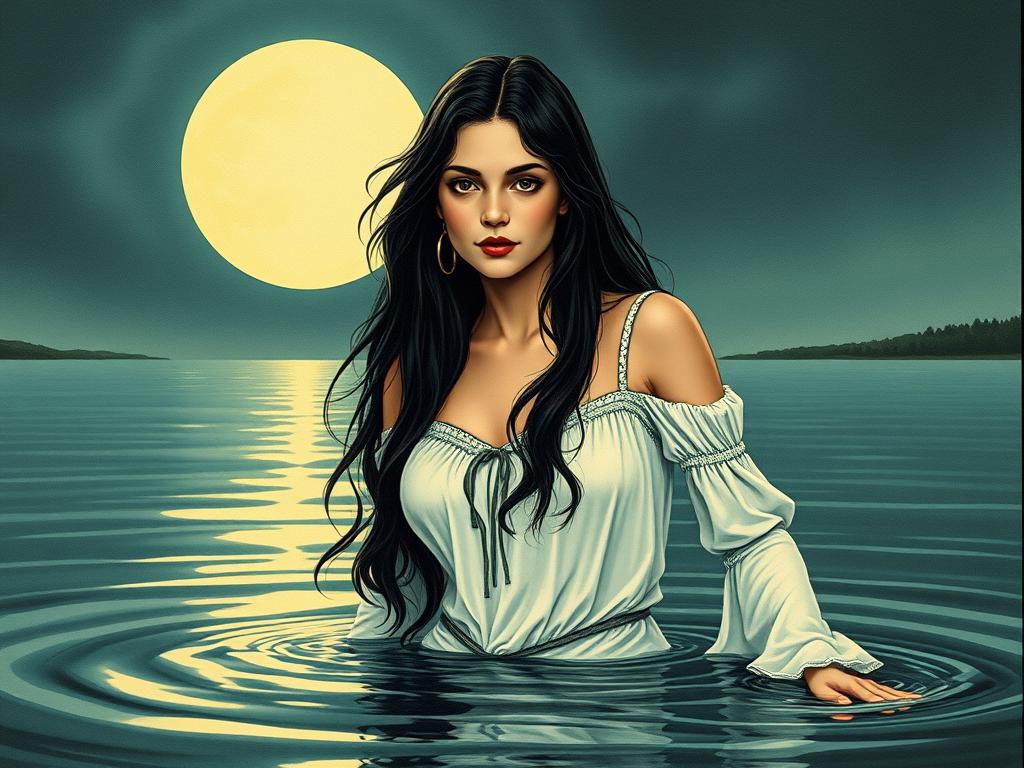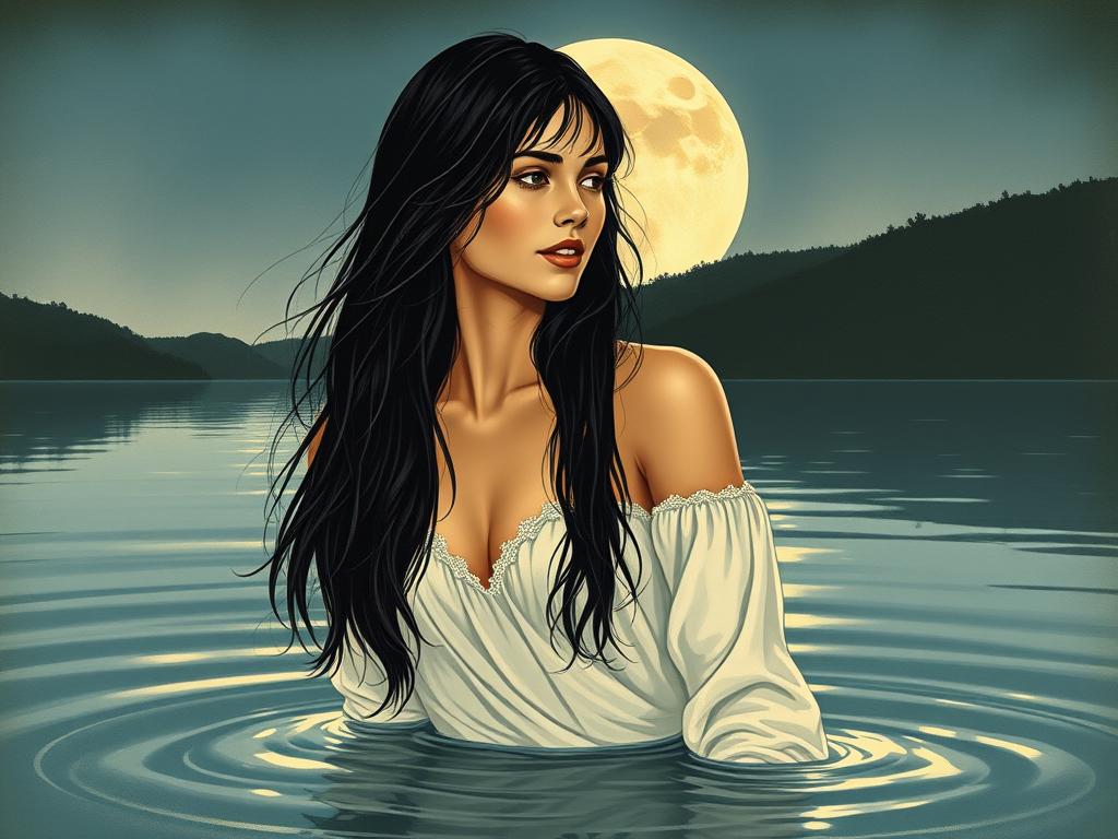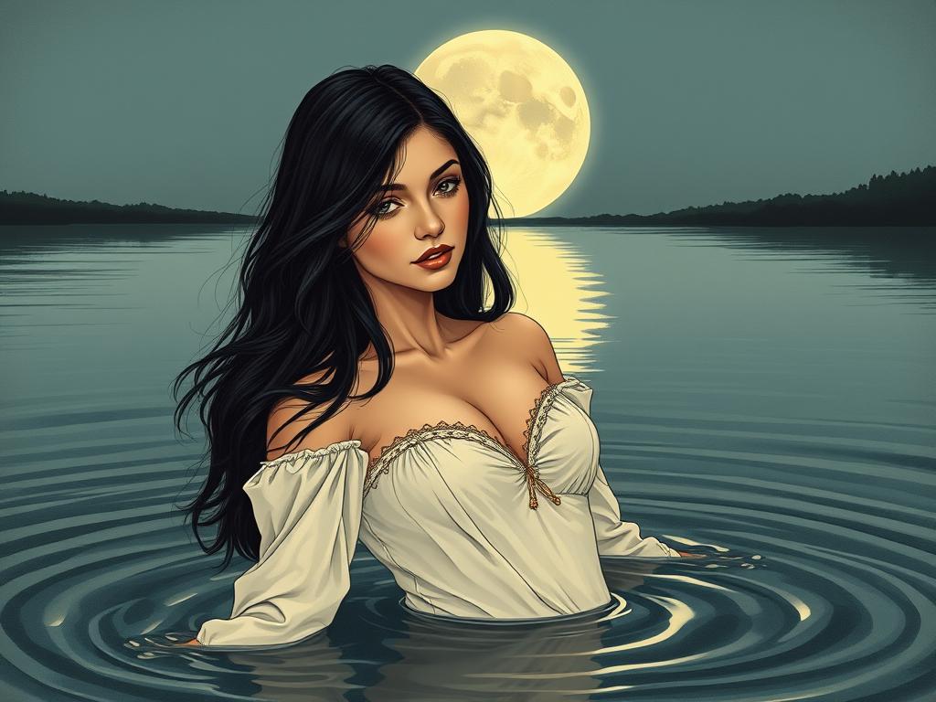 Vintage illustration of a 20-year-old woman with long black hair, emerging from a lake while the full moon glows behind her. She wears a white, long-sleeved camisole in the style of the Scottish clan era, clinging to her body.